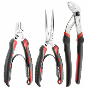 Jeu de trois pinces parfaitement complémentaires pour toutes les installations électriquespince à dénuder KNIPEX 11 06 160 VDE 1000V avec ressort d'ouverture : adaptable: pour conducteurs unifilaires, multifilaires et fils fins, isolation plastique ou caoutchouc jusqu'à Ø 5,0 mm et 10 mm'b2 ; forgéen acier à outils spécial, trempé à l'huilepince coupante de côté KNIPEX 70 06 160 VDE 1000V : polyvalente : également pour le fil dur jusqu'à Ø 2mm, coupe nette même aux extrémités ; acier électrique au vanadium, forgé, trempé à l huile en plusieurs phasespince à becs longs KNIPEX 26 16 200 VDE 1000V : flexible : pince demi-ronde avec pointes de précision flexibles et supportant la torsion; acier électrique au vanadium, forgé, trempé à l huile en plusieurs phases.